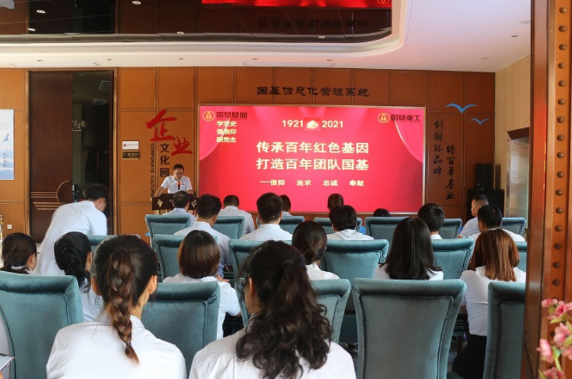 在出發(fā)往儋州?;◢u之前,國基的家人們在集團總部一樓大廳一起上黨課,共同傳承百年紅色基因,一起打造百年團隊國基。