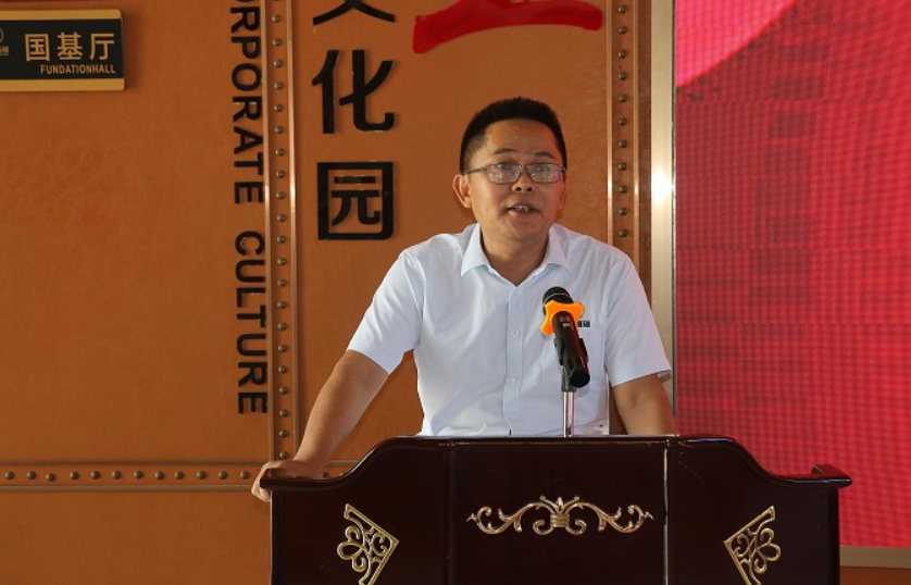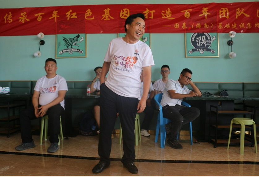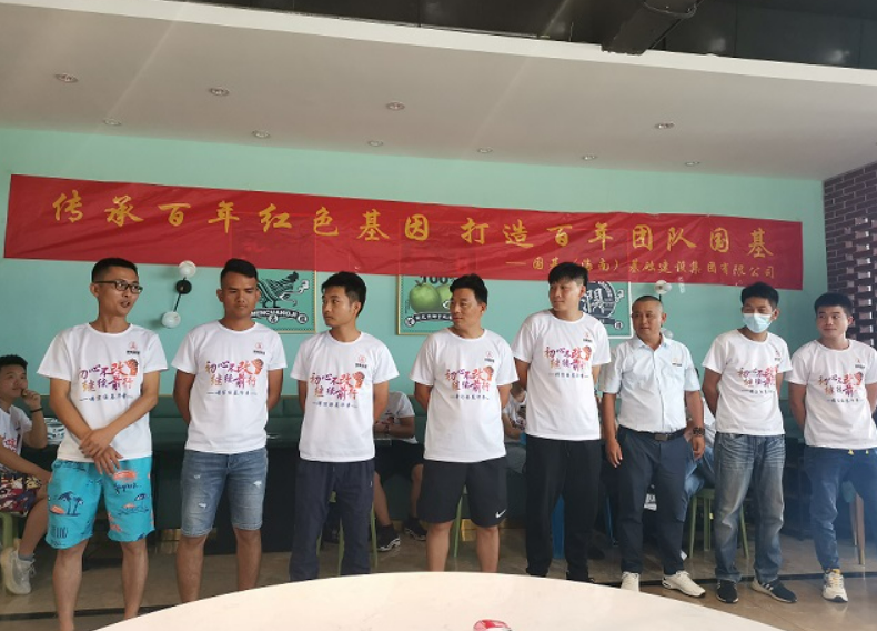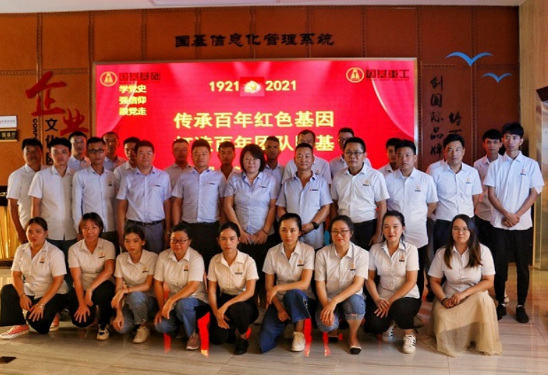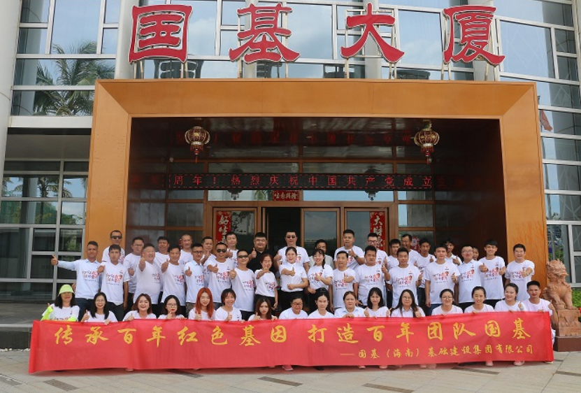 在出發(fā)往儋州海花島之前,國(guó)基的家人們?cè)诩瘓F(tuán)總部一樓大廳一起上黨課,共同傳承百年紅色基因,一起打造百年團(tuán)隊(duì)國(guó)基。