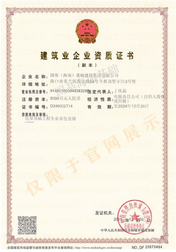 2019年12月20日,海南省住房和城鄉(xiāng)建設(shè)廳正式公布核準(zhǔn)我公司地基基礎(chǔ)工程專業(yè)承包壹級(jí)資質(zhì),此次資質(zhì)的成功升級(jí)是我公司資質(zhì)建設(shè)的又一個(gè)里程碑。 資質(zhì)升級(jí)成功后,公司在地基基礎(chǔ)領(lǐng)域?qū)⒂瓉砀鼜V闊的發(fā)展空間,也標(biāo)志著我公司在建筑行業(yè)中將具備更高的水準(zhǔn)。